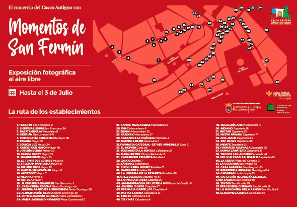 Se ha realizado un plano del Casco Antiguo que puede encontrarse en la web. www.cascoantiguopamplona.com donde aparecen localizados todos los establecimientos expositores, con el fin de poder seguir una ruta o itinerario de esta original exposición fotográfica al aire libre.